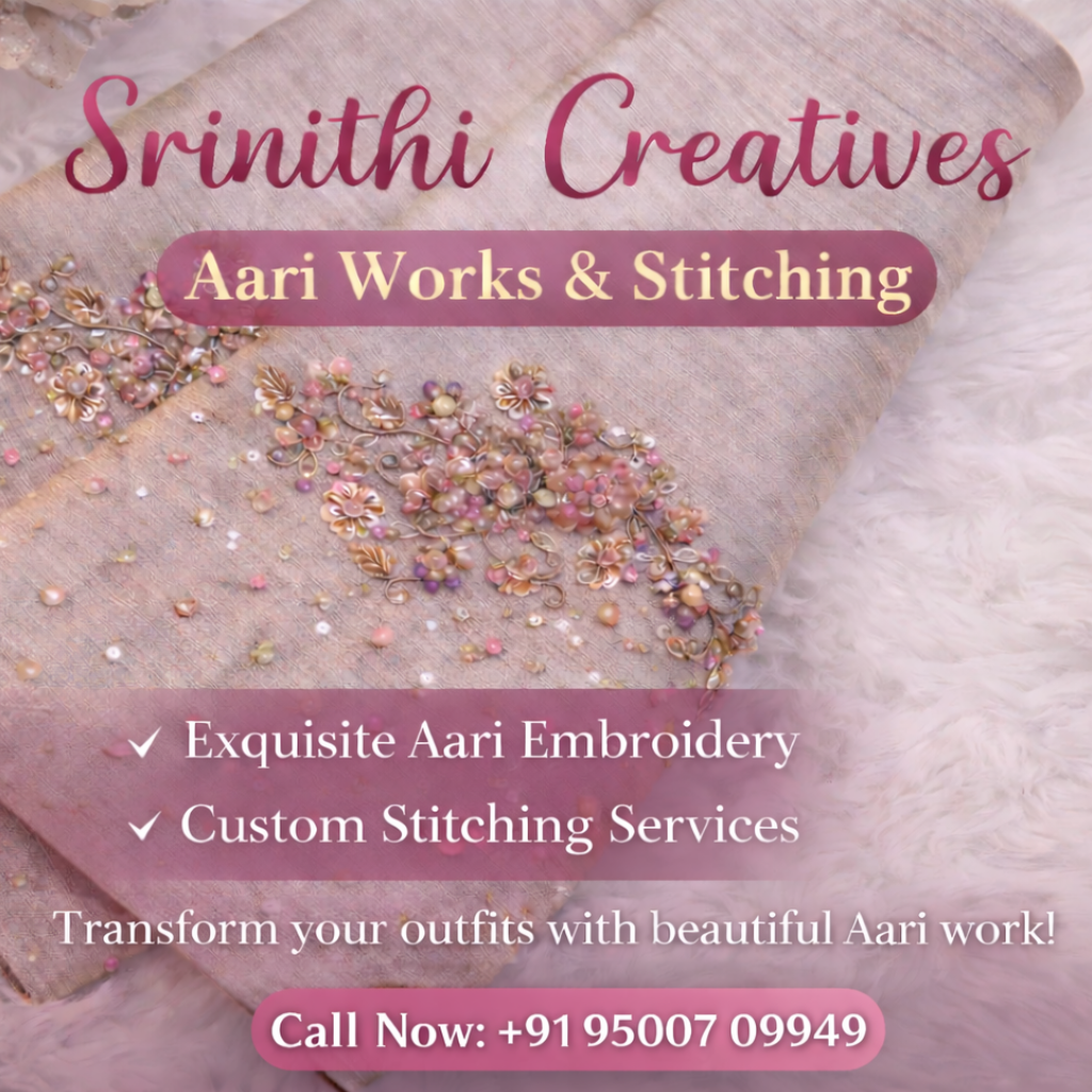 At Srinithi Creative Stitchery, we bring timeless craftsmanship to life through detailed embroidery and personalised tailoring. Our passion lies in creating designs that reflect tradition, elegance, and individual style.